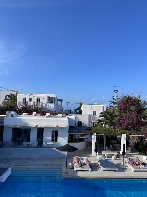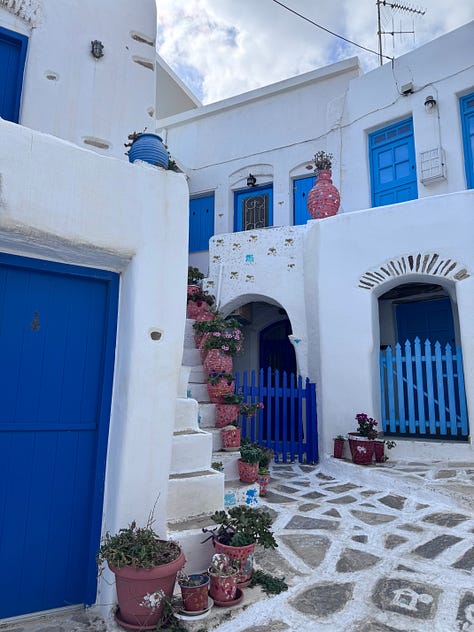 From Athens, we flew to Paros and instantly understood why people romanticize the Greek islands. Our hotel sat just off the main town, Naousa, where stone-paved streets were car-free and the buildings were the exact whitewashed charm you see on Pinterest, covered in bougainvillea (my favorite) with cats sunbathing in doorways.