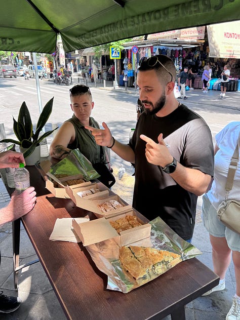 That evening, we decided at the last minute to join a Greek Food Walking Tour despite being exhausted, and ended up being one of our favorite memories from the entire trip. We tried dishes we never would’ve ordered on our own, wandered through charming streets, and spent hours eating and laughing with people from all over the world.