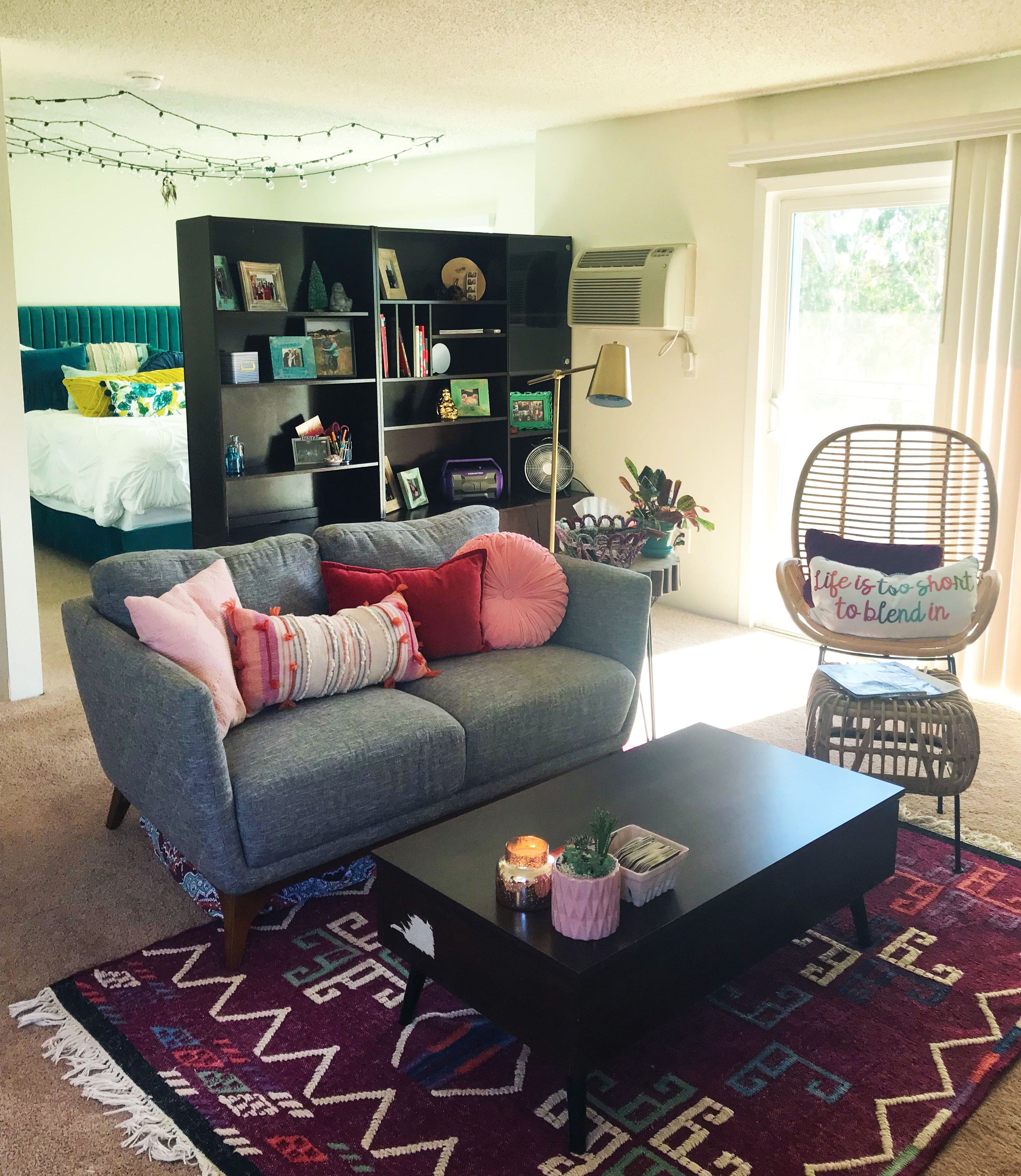 This space is truly my first space. I’m solely in charge and it only has to work for me at this point. I’ve embraced that and started to explore my style and try new things. Color has always been my favorite way to make a room pop, but in this small space, I’m learning how important practicality and functionality can be. For example, my Rattan chair from Target was the least practical decision I’ve made, AND it was the first piece of furniture I purchased. I went from using a card board box as a dinner table to sitting on this (it is more comfortable than it looks, but still) Yet this chair is still one of my favorite pieces in my apartment.